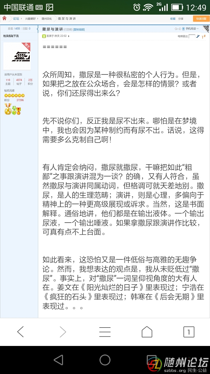 演講如同撒尿一般,看是否在人前臺(tái)上hold?。縣old住,就一瀉千里;hold不住,就憋到臉紅,心跳加速,手腳顫抖。由此,我聯(lián)想到人的狀態(tài)有兩種: 一種“憋的慌”。 一種“尿得爽”。 親愛(ài)的朋友,你是哪一種呢? 。。。。。。 我猛然起身,開(kāi)燈,看表,指針顯示六點(diǎn)三十分。果然,生物鐘到了撒尿時(shí)間??觳奖枷蛐l(wèi)生間,夢(mèng)中憋了整夜的一泡尿,撒得是酣暢淋漓。。。哈啊,怎一個(gè)“爽”字了得?! 草于18年12月11日午后 |