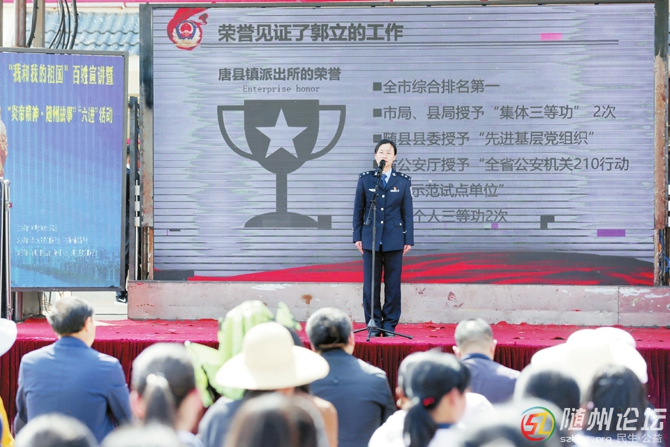 6 m4 Y* L" n3 n7 E. P7 R0 w 5月8日,“我和我的祖國”百姓宣講暨“炎帝精神·隨州故事”“六進”活動走進隨縣均川鎮(zhèn)。圖為隨縣唐縣鎮(zhèn)派出所民警吳小霞講述唐縣鎮(zhèn)派出所所長郭立的感人 ...
