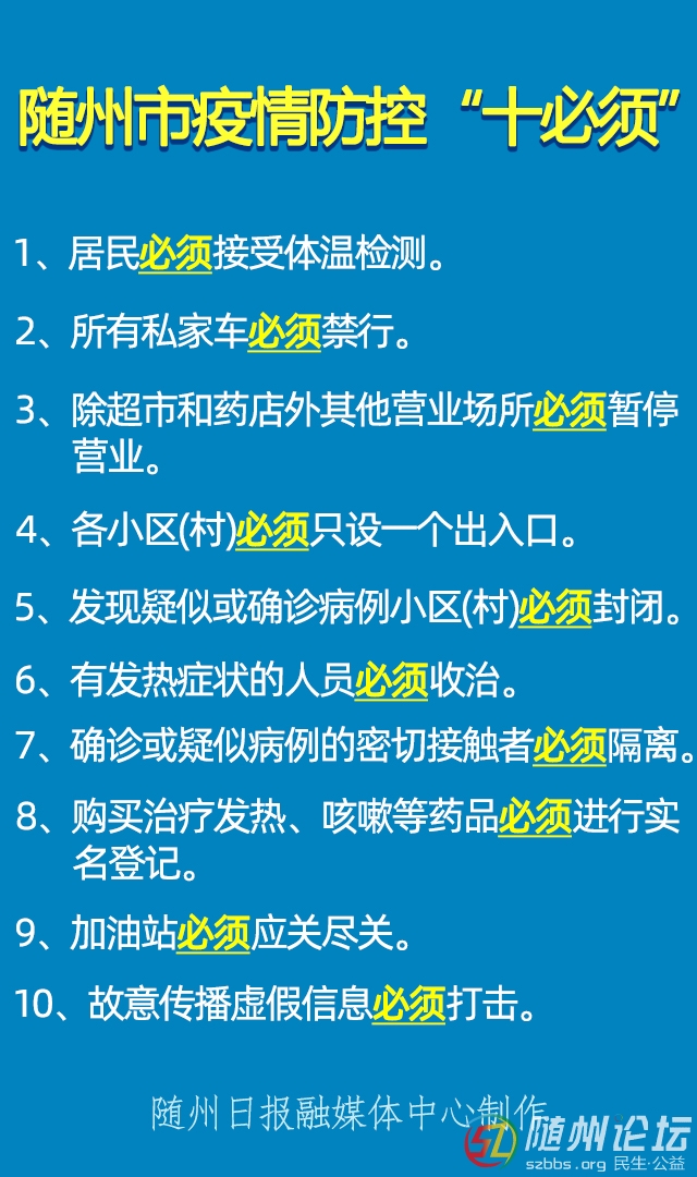 % S6 y6 q1 c( i" d5 i) T 隨州市疫情防控“十必須”1.居民必須接受體溫檢測(cè)。2.所有私家車必須禁行。3.除超市和藥店外其他營業(yè)場所必須暫停營業(yè)。4.各小區(qū)(村)必須只設(shè)一個(gè)出入口。5.發(fā)現(xiàn)疑似或確診病例小區(qū)( ...