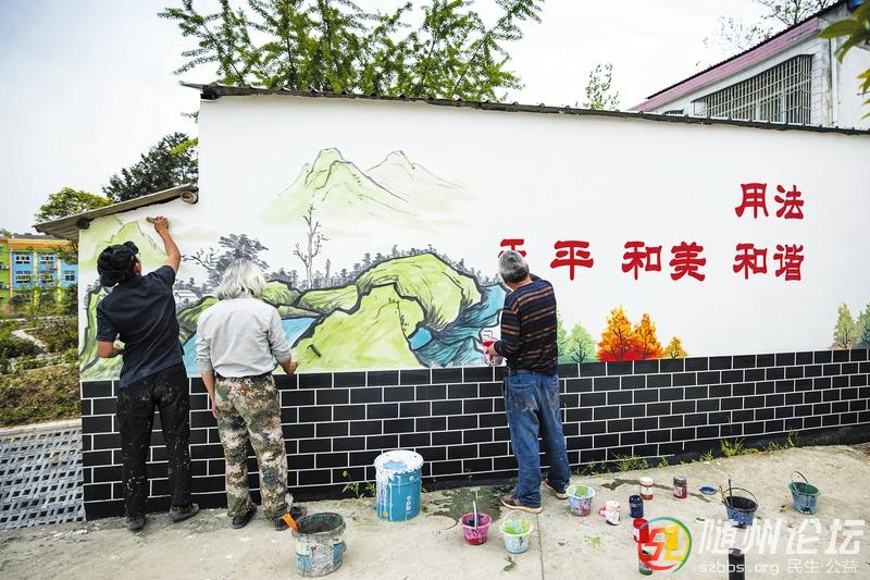 近年來,我市在大力推進美麗鄉(xiāng)村建設中,利用村民房屋的墻體,創(chuàng)作出一系列栩栩如生、富有鄉(xiāng)村氣息的藝術(shù)畫,把村莊裝扮得絢麗多彩,成為鄉(xiāng)村一道亮麗風景線。圖為4月19日,楊俊敬等3名書畫藝術(shù)家正在曾都區(qū) ...
