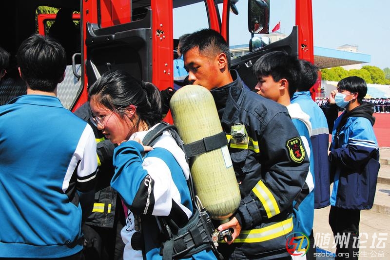 近日,廣水市第一高級(jí)中學(xué)組織開展消防逃生應(yīng)急疏散演練。消防官兵針對(duì)演練情景作出詳細(xì)點(diǎn)評(píng),現(xiàn)場(chǎng)講解消防知識(shí)。師生們參觀了消防器材裝備區(qū)。圖為部分學(xué)生佩戴試穿個(gè)人防護(hù)裝備,化身小小“消防員”。 (隨 ...