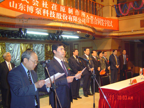 新聞中心 2005年4月27日,在博山萬杰國際大酒店山東博泵科技股份有限公司與日本株式會(huì)社荏原制作所正式簽署了注冊資本1100萬美元的合營公司――荏原博泵有限責(zé)任公司。該公司的建立將通過引進(jìn)世界最大的泵企業(yè)――日本株式會(huì)社荏原制作所的先進(jìn)技術(shù),加快大型泵、高壓泵國產(chǎn)化進(jìn)程,建成具有國際競爭力的一流企業(yè)。為中國水電、核電及超臨界火電項(xiàng)目,為南水北調(diào)等大型水力工程提供高質(zhì)量、高技術(shù)含量的一流泵產(chǎn)品,提升中國機(jī)械工業(yè)技術(shù)、質(zhì)量水平,促進(jìn)產(chǎn)品更新?lián)Q代,為中國電力、冶金、水力事業(yè)的發(fā)展乃至中國國民經(jīng)濟(jì)的發(fā)展做出應(yīng)有的貢獻(xiàn)。