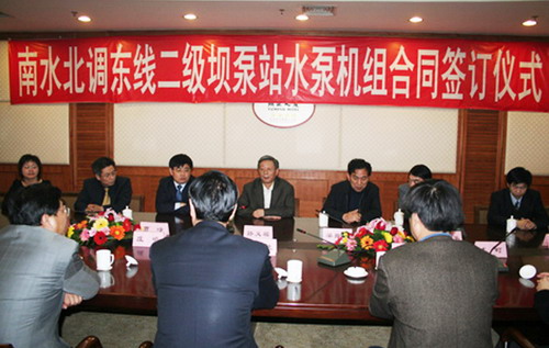 新聞中心 3月12日,南水北調(diào)東線一期工程二級壩泵站簽字儀式在山東省濟南頤正大廈隆重舉行;山東省水利廳領(lǐng)導、淄博市領(lǐng)導及荏原博泵李正民副總帶隊參加了簽字儀式。荏原博泵在南水北調(diào)主線泵站中標,標志著我公司大型泵的制造將有新的突破。