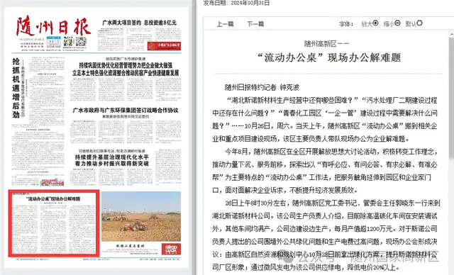 10月31日,《隨州日報》第1版報道《隨州高新區(qū)——“流動辦公桌”現(xiàn)場辦公解難題》,盛贊隨州高新區(qū)以開展解放思想大討論活動為契機(jī),推動力量下沉、服務(wù)前移,探索出以“有呼必應(yīng)、有問必答、有求必解、有難必幫”為主要特點的“流動辦公桌”工作法,把服務(wù)觸角延伸到園區(qū)和企業(yè)家門口,面對面解決企業(yè)訴求,不斷提升經(jīng)濟(jì)發(fā)展質(zhì)效。